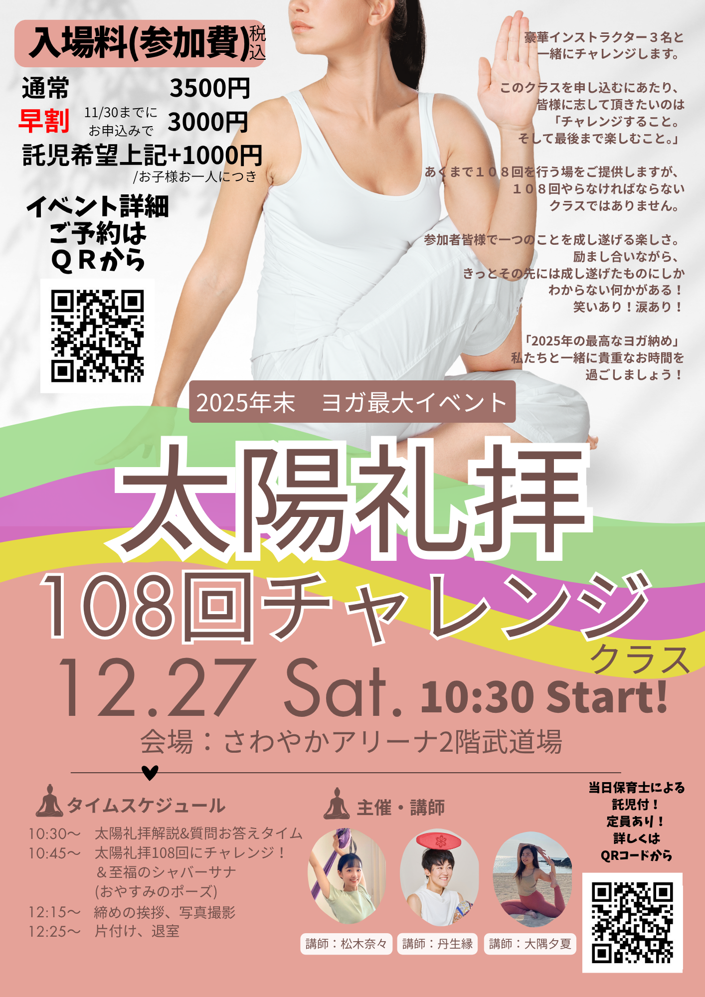今年もやります!!!年末ヨガ最大イベント!なんと今年は「50名」を定員としたかなりビッグなイベントで2025を締めくくります!そして今回のイベント。最高なヨガ納めとなること間違いなし!その理由は、、、是非このまま最後ま…